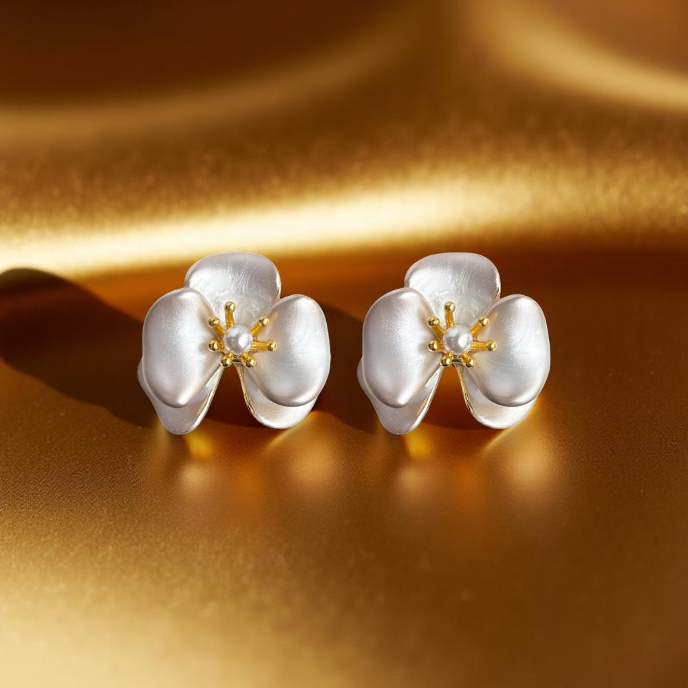 A delicate ode to nature’s elegance, these floral-inspired earrings bloom with timeless charm. Each petal is sculpted in luminous pearl-white enamel, accented with golden stamens that cradle a single gleaming pearl at the heart. Their soft shimmer and graceful form make them the perfect statement of sophistication—whether worn daily or reserved for life’s most memorable moments.